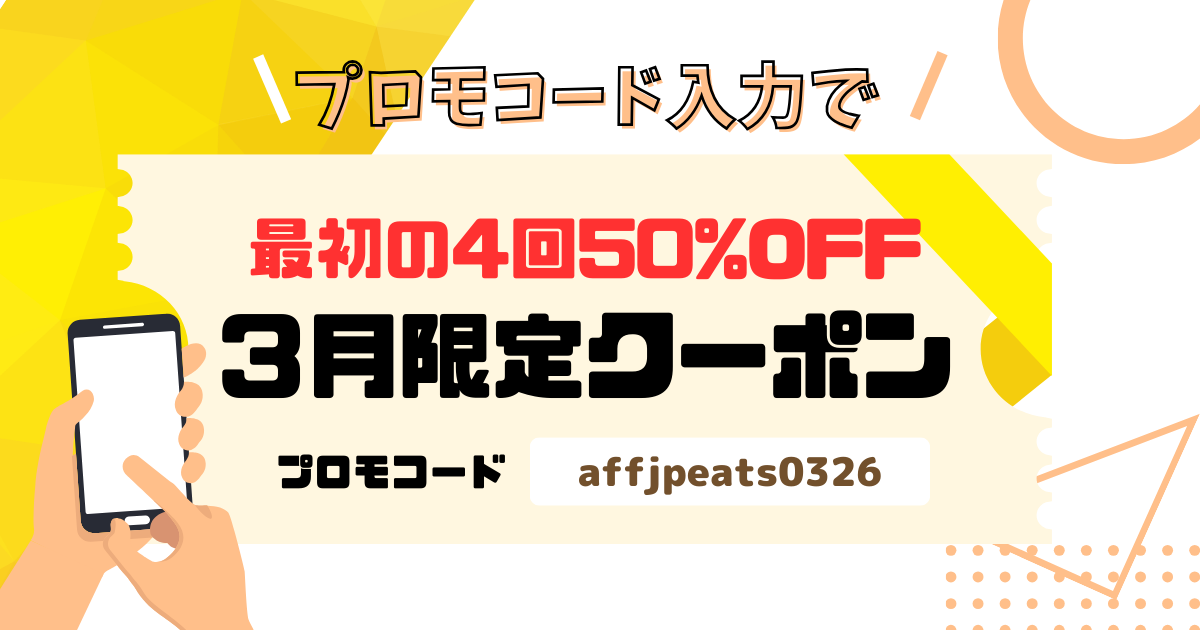 Uber Eats(ウーバーイーツ)でプロモーションコード「affjpeats0326」を入力すると、4回まで50%OFFになる初回限定クーポンが受け取れます。