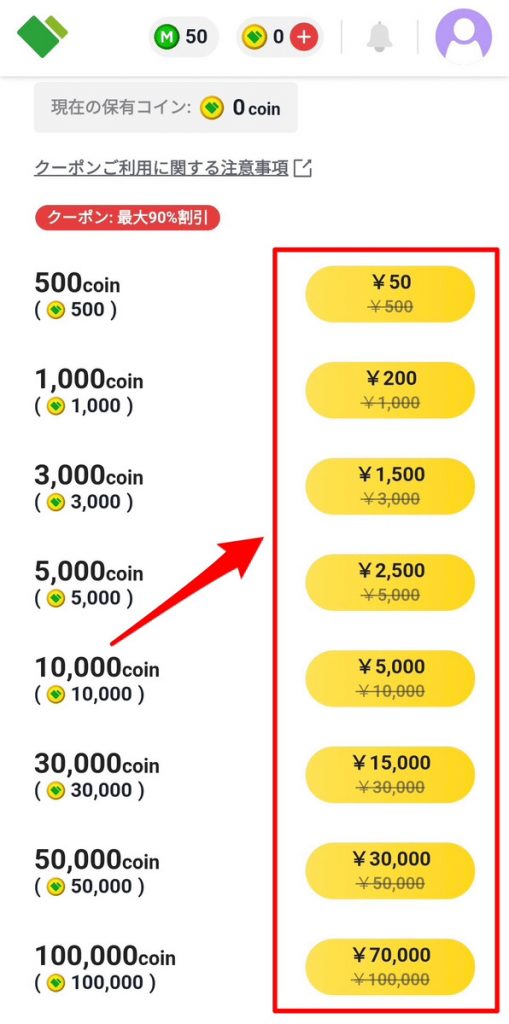 具体的には、500コインを購入する際に90%OFFクーポンが適用され、本来500円のところ50円で購入が可能です。