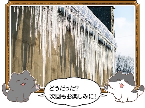 今週は「脳トレ!モザイククイズ」です。今回は、氷点下の朝に目にするものに関する出題です。少しずつヒントを出していくから、「なんだろ?もしかして?」と想像を楽しみながら考えてニャ!