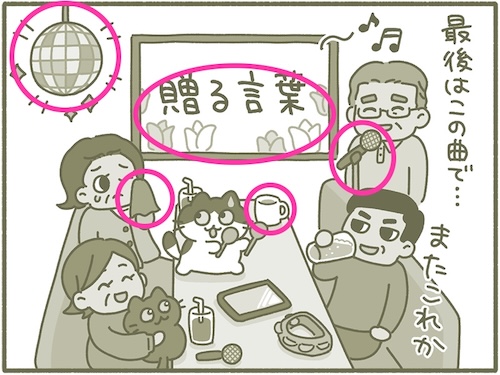 だれを送別することもないのに、カラオケを楽しむ大人たち(とマメとトク)です。さて、2枚の絵には違うところが5つ。全部、正解してニャ!