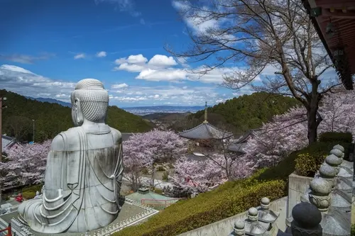 大仏や三重塔と桜が織りなす景観は、歴史と自然が調和したこの寺ならではの趣を感じさせます。